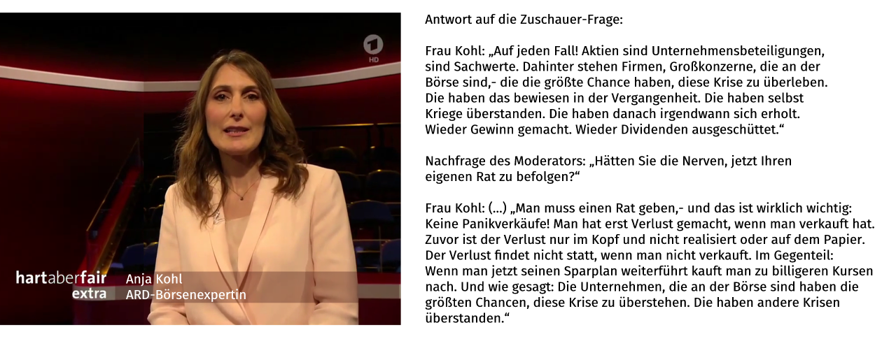 wir möchten heute gerne einen Sendungs-Ausschnitt von „hart aber fair“ (ARD, 16. März 2020) sowie die Börsenkolumne aus der focus money (Ausgabe vom 11.03.2020) mit Ihnen teilen und bleiben bei unserer Meinung: